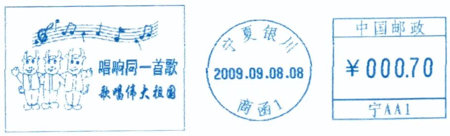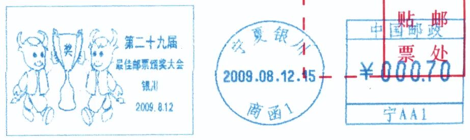 2009年为己丑(牛)年,宁夏银川市邮政于1月19日启用“己丑年”邮资机宣传戳1枚(图19),同年8月12日启用的“第二十九届最佳邮票颁奖大会”和9月8日启用的“唱响同一首歌 歌唱伟大祖国”邮资机宣传戳则均以卡通牛为主角(图20、21)。