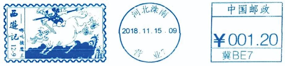 第一个是牛魔王,他是《西游记》中的大魔王,自身实力最为强大,是为数不多可以不靠法宝而以自身武力与孙悟空匹敌的角色。牛魔王在与孙悟空斗法时,使用了禁术法天相地,经佛祖钦点、玉帝同意而委派李天王和哪吒前去帮助孙悟空,最终哪吒利用斩妖剑和乾坤圈才降伏了牛魔王。河北滦南县邮政于2018年11月15日启用“西游记——哪吒擒魔王”邮资机宣传戳1枚,表现了哪吒手持斩妖剑对战牛魔王的一幕(图27)。第二个是青牛怪,本是太上老君的坐骑,偷了太上老君的金刚琢后在金兜山金兜洞作怪。他利用金刚琢套住孙悟空的金箍棒,没有了武器的孙悟空自然不是青牛怪的对手。之后悟空去天宫求助,但李天王、哪吒、火德星君等天兵天将以及如来佛祖派来的十八罗汉均败下阵来。后经如来佛祖提示,孙悟空遂去请太上老君出手才降服了青牛怪。不过严格来说,此“青牛”却并非“牛”,乃是上古瑞兽“兕”。河北滦南县邮政于2019年4月20日启用“西游记——青牛逞神通”邮资机宣传戳1枚,表现了哪吒落荒而逃的一幕,可惜的是戳上描绘的青牛怪模糊不清(图28)。