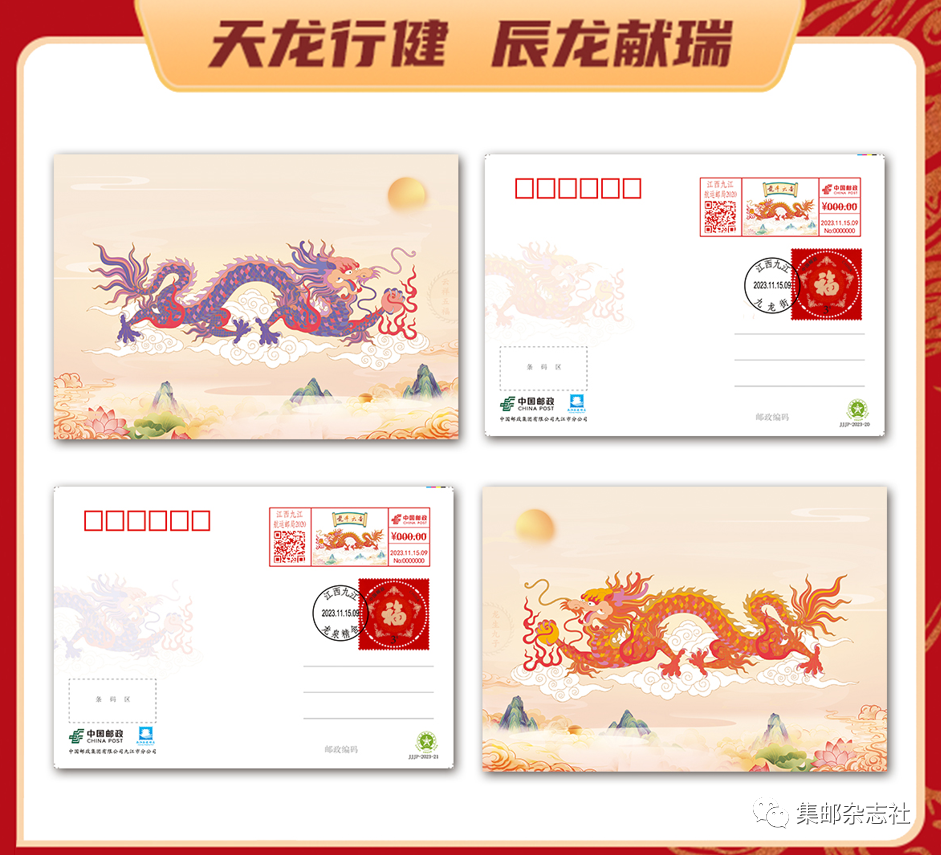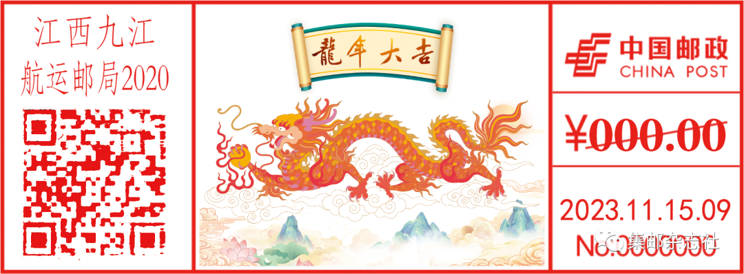 经中国邮政集团有限公司批准,江西省九江市邮政分公司将于2023年11月15日启用“龙年大吉”彩色数字打印型邮资机戳一枚。 为方便大家收藏,《集邮》杂志微店上架了该枚邮资机戳的实寄明信片。实寄明信片一组两枚,使用美术明信片为载体,启用首日加盖邮资机戳,每枚明信片另加贴“福”邮票一枚,分别盖销“江西九江 九龙街”“江西九江 龙泉精舍”日戳,挂号实寄给预订者。识别上方二维码即可预订。