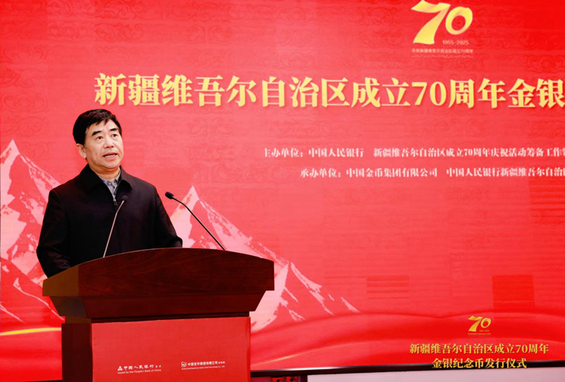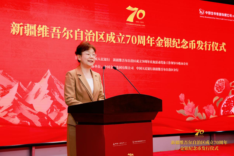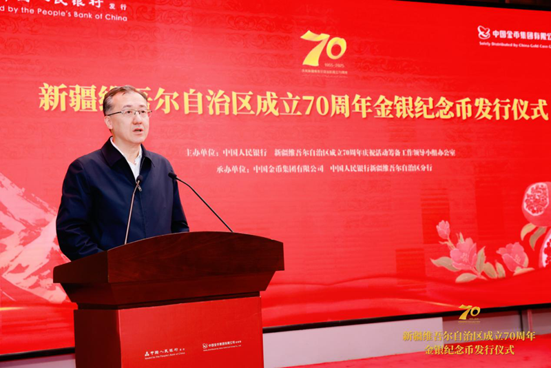 中国金币集团有限公司党委书记、董事长焦瑾璞发表致辞。他表示,中国人民银行发行新疆维吾尔自治区成立70周年金银纪念币,是新疆维吾尔自治区成立70周年各项庆祝活动中一项重要的内容。在此次纪念币设计上,主要使用了新疆维吾尔自治区成立70周年庆祝活动标识作为主图案,体现了整体庆祝活动的统一性和一致性;生产工艺上,运用了镜面、多层次喷砂、光变鳞彩等国内外先进的造币工艺,将新疆维吾尔自治区成立70周年的欢庆气氛,永久地镌刻在贵金属纪念币方寸之中。通过这套贵金属纪念币精品,更好地展现了新疆维吾尔自治区在党中央领导下同心协力、砥砺奋进,在中国式现代化进程中更好建设美丽新疆的蓬勃朝气。