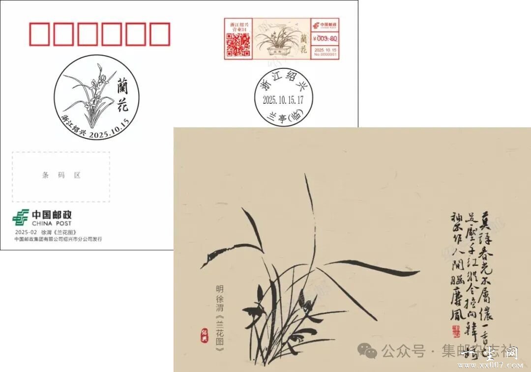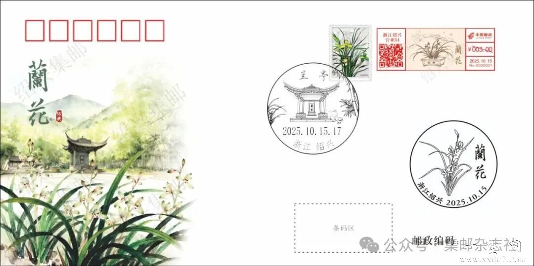包含一封一片,使用美术封、美术明信片为载体,均加盖浙江绍兴邮政分公司启用的“兰花”彩色数字打印型邮资机戳,实寄封加盖兰亭风景日戳和兰花纪念戳;美术明信片分别加盖兰亭临时日戳和兰花纪念戳,启用首日挂号实寄给预订者。识别上方二维码即可预订。