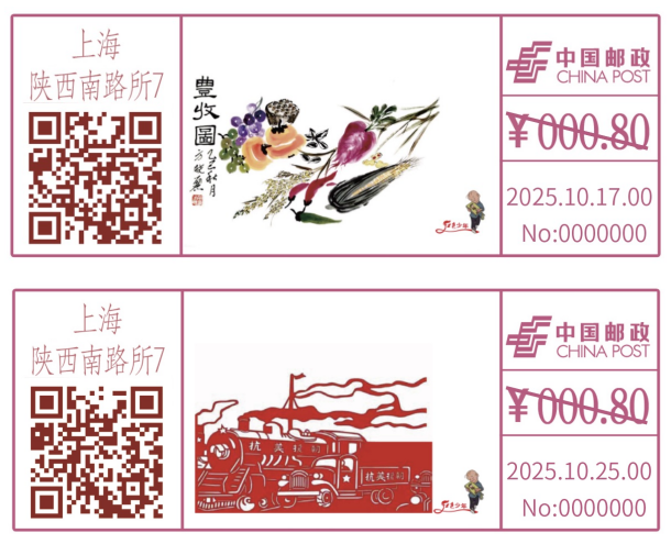 现定于2025年10月17日、10月25日、10月29日启用《2025年红色少年十月》系列CX51型邮资机戳各1枚,共3枚。按启用时间顺序分别为:《丰收》《抗美援朝》《搀扶》。邮资机戳使用期限:启用当日。发售及收寄网点:陕西南路邮政所。咨询电话:64664267。
