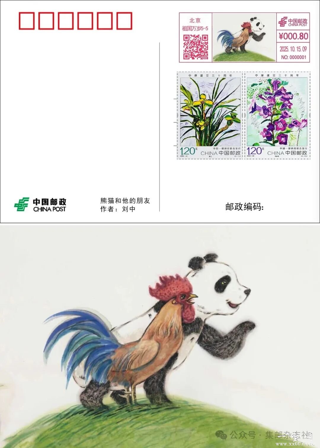 使用美术明信片为载体,发行首日加贴邮票一套2枚,使用北京祖国万岁主题邮局同日启用的“熊猫和他的朋友”彩色数字打印型邮资机戳补资,挂号实寄给预订者。识别上方二维码即可预订。