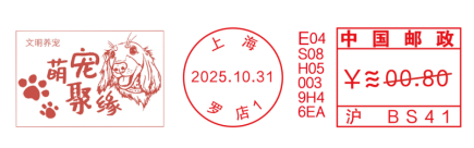 现定于2025年10月31日启用《文明养宠-萌宠聚缘》YFM118E型邮资机戳1枚。邮资机戳使用期限:启用当日。 因活动需要,盖戳地址:上海市宝山区罗店镇远景村月罗公路3359号(9:00-10:30)。联系手机:13564814013。 同日下午支局有售,发售及收寄网点:罗店邮政支局。咨询电话:66862667。 特此公告。 附图:(以实物为准) ![]()