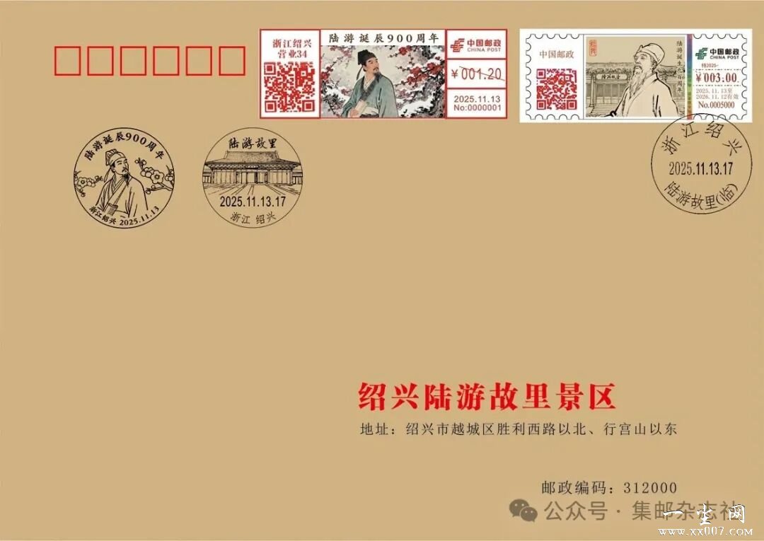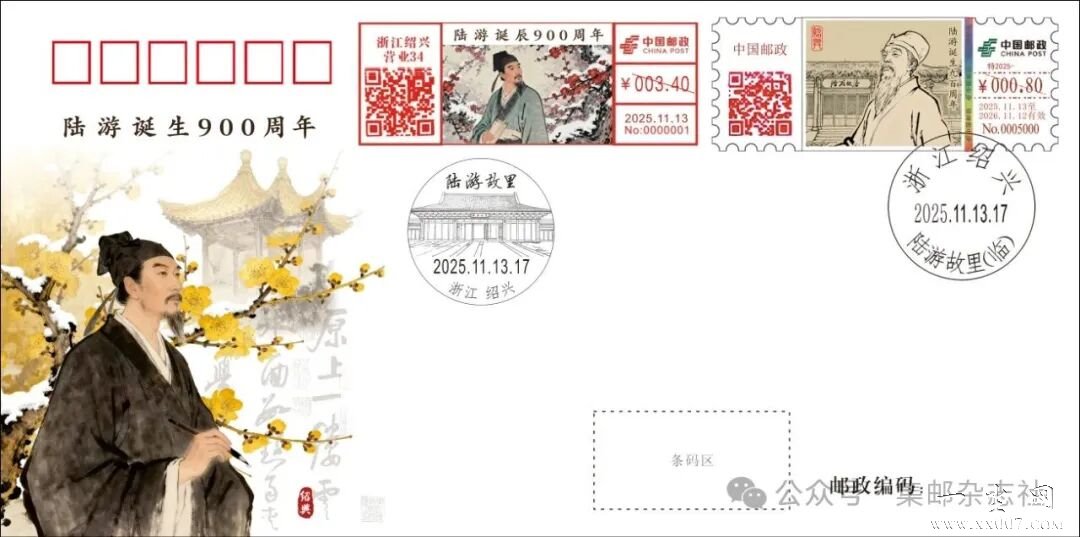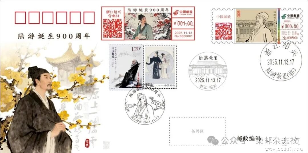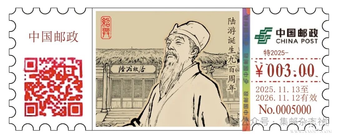 中国邮政集团有限公司将于2025年11月13日启用“陆游诞生九百周年”彩色数字打印型邮资机戳一枚。