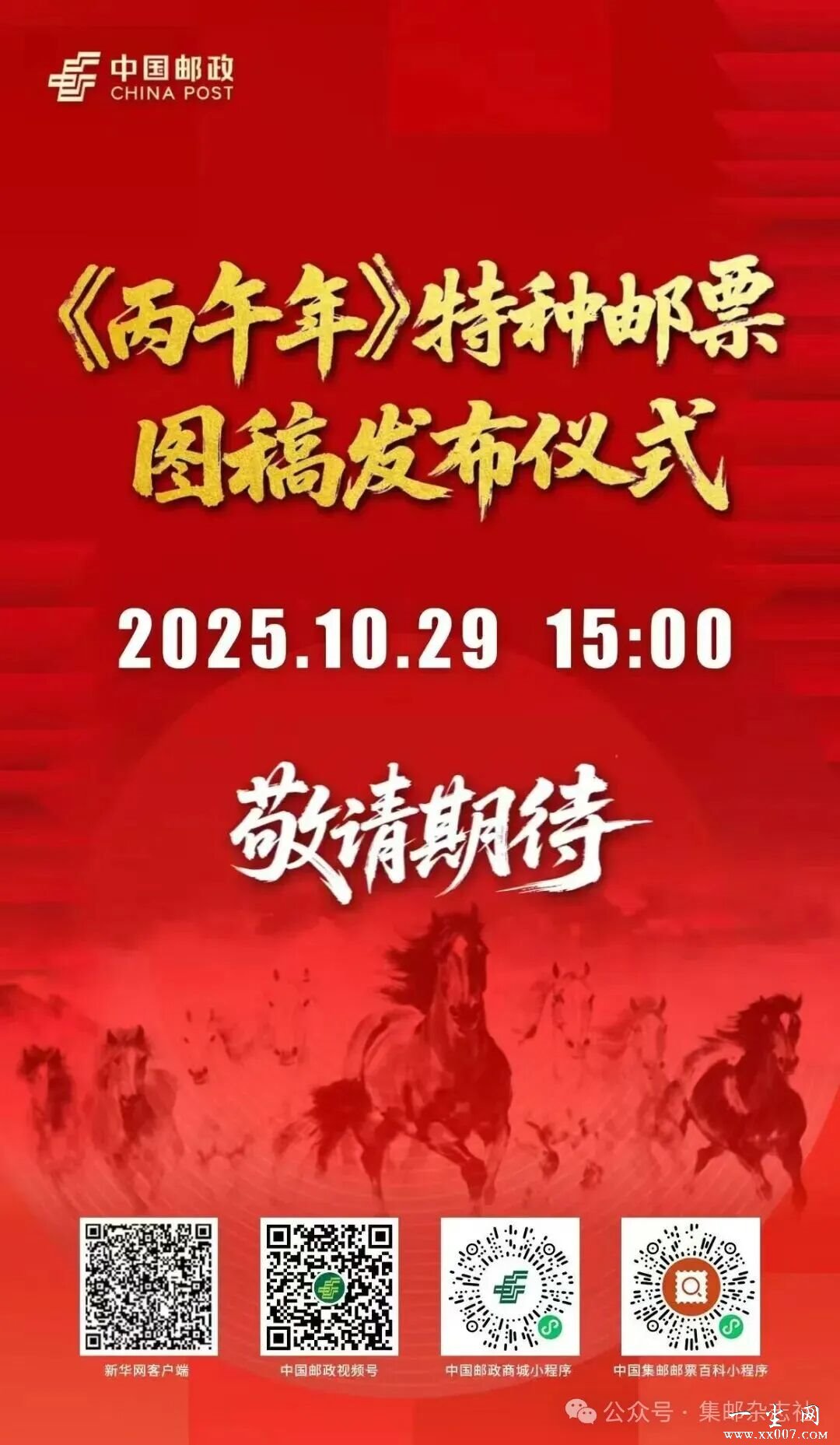 2025年10月29日15点,中国邮政将发布《丙午年》邮票图稿。