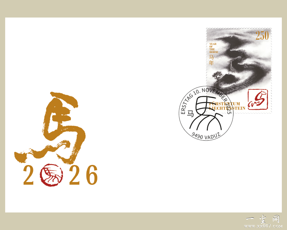 延续第二轮生肖邮票每年邀请中国杰出艺术家、设计师设计的做法,继龙年、蛇年分别由冷冰川、潘虎设计,列支敦士登邮政今年有幸邀请到世界知名的设计师和艺术家,来自中国香港的靳埭强先生设计马年邮票。靳先生属马,此前已经设计了3套香港马年邮票(1978,1990,2014),与马有缘。此次为列支敦士登设计马年邮票(2025年发行),锦上添花,尤为难得。此番靳叔能为“邮票王国”设计生肖邮票,缘起于其学生吴玮 (此前为列支敦士登邮政设计了《千里江山图》邮票)的引荐,成就了这段艺界美谈。 靳埭强(Kan Tai-keung,1942年出生),人称“靳叔”,设计师、艺术家和设计教育工作者,香港理工大学荣誉教授、荣誉博士,设计界的传奇人物。1942年生于广东番禺,1957年定居香港,1967年开始投身平面设计工作,1969年起同时探索新水墨画创作。1970年起投身设计教育,编著设计书籍30余种。1999年创立“靳埭强设计奖”。靳氏也是中国银行Logo的设计者。 邮票:主体由“文字山水——马字”和篆刻“马字”构成。靳叔独创的“文字山水”是其艺术创作中的核心概念之一,这种独特的艺术表达方式将汉字、中国传统书法与山水画的美学精神相融合,同时融入现代设计思维,形成了独特的艺术风格。这幅画以草书“马”字绘成高山连绵,流水千丈,劲松长青,坐看云起。祝愿国泰民安,世界和平。这幅画是典型的“靳叔风格”,其中松树旁边独坐的观者就是他自己的写照。篆刻是把行书“马”字与马的造型的结合。行书肖形融合,设计成“跃马扬威”之意象。(“肖形印”是篆刻艺术中以图形为主要表达对象的印章形式)。