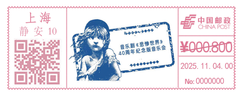 现定于2025年11月4日启用《音乐剧<悲惨世界>40周年纪念版音乐会》CX51型邮资机戳1枚。邮资机戳使用期限:启用当日。发售及收寄网点:静安邮政支局。咨询电话:62886108。