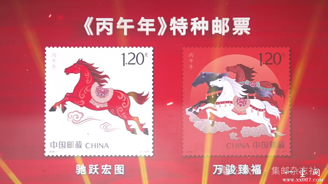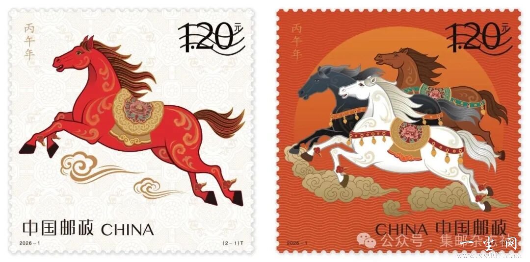 ![]() ![]() ![]() ![]() ![]() ![]() 《丙午年》特种邮票由王红卫、赵恩重设计。邮票第一枚图名为“驰跃宏图”,以“腾跃新时代”为核心意象,展现了一匹红马奔驰于祥云之上,鬃毛如焰,四蹄生风。第二枚图名为“万骏臻福”,以“万马奔腾,驰骋千里”为核心意象,展现了三匹奔跑的骏马。三为众,寓意奔腾不息、共同奋进。图案背景及马身辅以祥云纹、火焰纹、缠枝纹等传统吉祥纹样,既隐喻福运连绵,亦强化东方美学底蕴。邮票中的骏马既展现出“一马当先”的开拓气概,也诠释了“万马奔腾”的团结力量,将马的形象与新时代中国人民奋发进取的精神风貌完美融合于方寸之间。