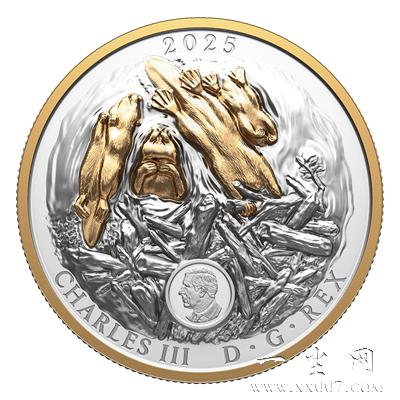 把银币翻到正面,便能看到与背面图案相互呼应的水下世界:之前紧随雌性河狸的幼崽,此刻在水下清晰展露身形;小家伙在水中舒展的娇憨模样,格外惹人怜爱。雌性河狸插入树枝的动作,从水下看去更加清晰,甚至连树枝沉入水中的下半段都能看见,形成视觉上的连贯;而雄性河狸探入水中的头部与上肢,在正面视角下则显得更为完整,毛发的纹理与水面折射的光影交织在一起,巧妙营造出沉浸式的水下氛围。巢堆上是艺术家史蒂文·罗萨蒂(Steven Rosati)设计的国王查尔斯三世肖像,下方刊“国王查尔斯三世·蒙神之恩”字样,上缘刊年号。