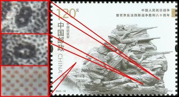 9月3日发行的2025-18《中国人民抗日战争暨世界反法西斯战争胜利八十周年》邮票由北京邮票厂有限公司采用金、红、浅咖啡、灰、黑5色调频网胶印印刷。防伪方式上除《新邮通告》公布的防伪纸张(彩点荧光防伪纸张)、防伪油墨(灰色显褚红色荧光防伪油墨)、异形齿孔(两竖边中间各有一椭圆形齿孔)和荧光喷码,还采用了缩微文字和局部调幅网胶印。