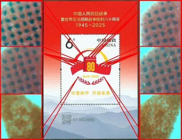 小型张邮票上中国人民抗日战争暨世界反法西斯战争胜利80周年纪念活动标识中的橄榄枝左右两端有镂空印刷的缩微数字“8”“0”,单个数字宽约0.20毫米,高约0.35毫米。纪念活动标识中的长城上有调幅网胶印的黑色网点。