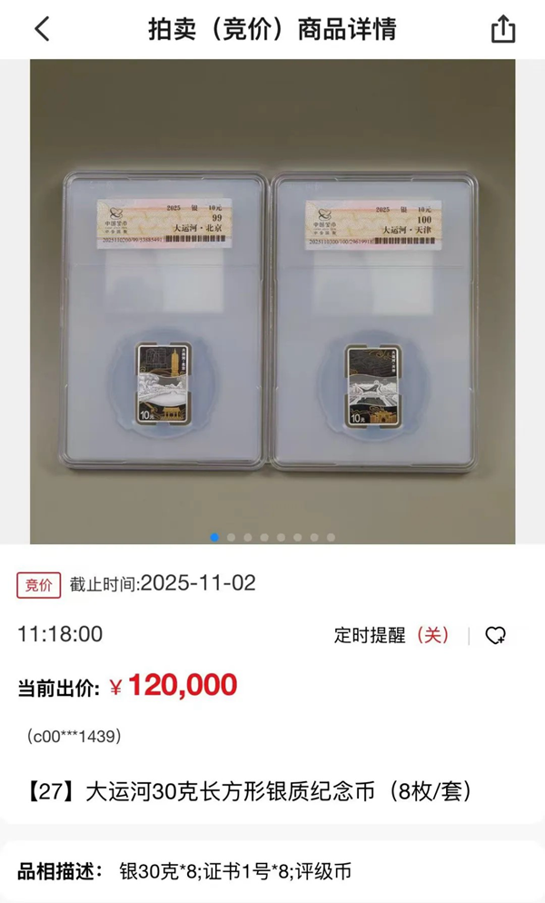大运河系列的金银纪念币,也拍出了极为不错的价格。大运河金银纪念币是首次兼顾世界文化遗产和国家文化公园的两大主题项目,既能展现中国古代悠久的历史文化,又能展现新时代运河建设成就与风貌。