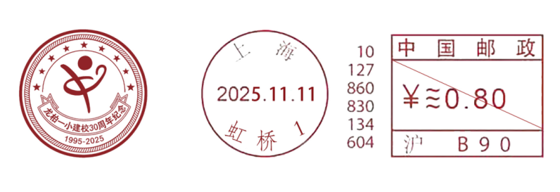 现定于2025年11月11日启用《龙柏一小建校30周年纪念》YFM118E型邮资机戳1枚。邮资机戳使用期限:2025年11月11日-2025年11月12日。 因活动需要,11月11日盖戳地址:上海市闵行区黄桦路110弄龙柏第一小学(9:30-16:30)。联系手机:13816100783。 11月12日发售及收寄网点:金汇花园邮政所。咨询电话:64025342。 特此公告。 附图:(以实物为准) ![]()