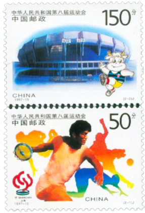 1997年10月12日,中国邮政发行《中华人民共和国第八届运动会》纪念邮票,全套2枚,小全张1枚。邮票图案分别为“会徽、运动员”和“吉祥物、场馆”。中华人民共和国第八届运动会于1997年10月12日至24日在上海举行。来自全国各地及解放军、行业体协的46个代表团约15000人参加了决赛,是二十世纪我国规模最大、参赛人数最多并与奥运项目接轨最紧密的一次体育盛会。