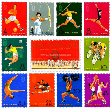 第一届全运会于1959年9月13日在北京开幕。毛泽东、刘少奇等中国领导人出席了开幕式。运动会共设36个比赛项目,有7人4次打破4项世界纪录,664人844次打破和刷新106项全国纪录。1959年12月28日,为纪念中华人民共和国第一届全国运动会,中国邮政发行《第一届全国运动会》纪念邮票,一套16枚。整套邮票展现出中国运动员奋发努力的精神风貌和中国发展体育事业的勃勃雄心。