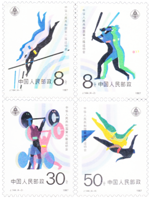 1987年11月20日,中国邮政发行《中华人民共和国第六届运动会》纪念邮票,全套4枚。邮票图案分别为“撑竿跳高”“女子垒球”“举重”“跳水”。中华人民共和国第六届运动会于1987年11月20日至12月5日在广东举行。这一届全运会规模盛大,有各省市、自治区和解放军以及火车头、前卫体协等37个代表团参加。