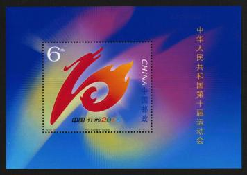 2005年10月12日,中国邮政发行《中华人民共和国第十届运动会》小型张。此枚小型张的图案设计得非常有特色,主体图案由10变化而来,但远而观之又像是“苏”字,生动形象地照应了主题。第十届全运会于2005年10月12日在中国江苏举行,共设了32个体育竞赛项目,反响热烈。