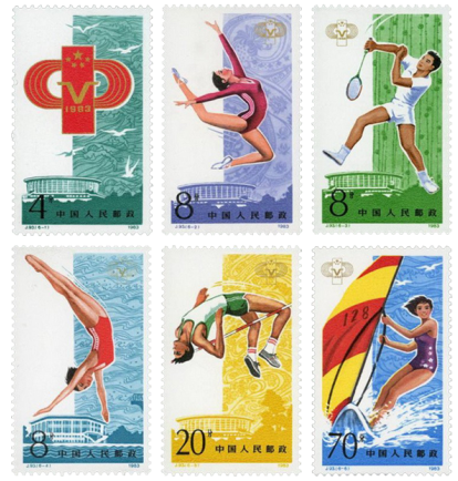 1983年9月16日,中国邮政发行《中华人民共和国第五届运动会》纪念邮票,全套6枚。邮票图案分别为“会徽”“体操”“羽毛球”“跳水”“跳高”“帆板”。第五届全运会于1983年9月16日至10月1日在上海举行。比赛项目有足球、篮球、排球、田径、体操、水球等25项。参加单位有各省市、自治区、中国人民解放军及火车头体协等32个代表团。