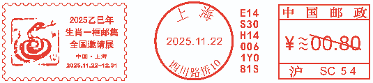 现定于2025年11月22日启用《2025乙巳年生肖一框邮集全国邀请展》YFM118E型邮资机戳1枚。邮资机戳使用期限:启用当日。发售及收寄网点:四川路桥邮政支局。咨询电话:63063972。