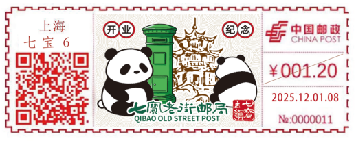 现定于2025年12月1日启用《七宝老街邮局开业纪念》CX51型邮资机戳1枚。邮资机戳使用期限:启用当日。