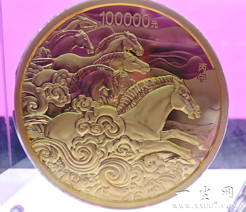 其中,重达10公斤的超大规格金币成为全场焦点。该币背面图案以昂扬奔腾的群马构成,祥云环绕其中,远景映衬层叠的山峦,展示出气势磅礴的景象。