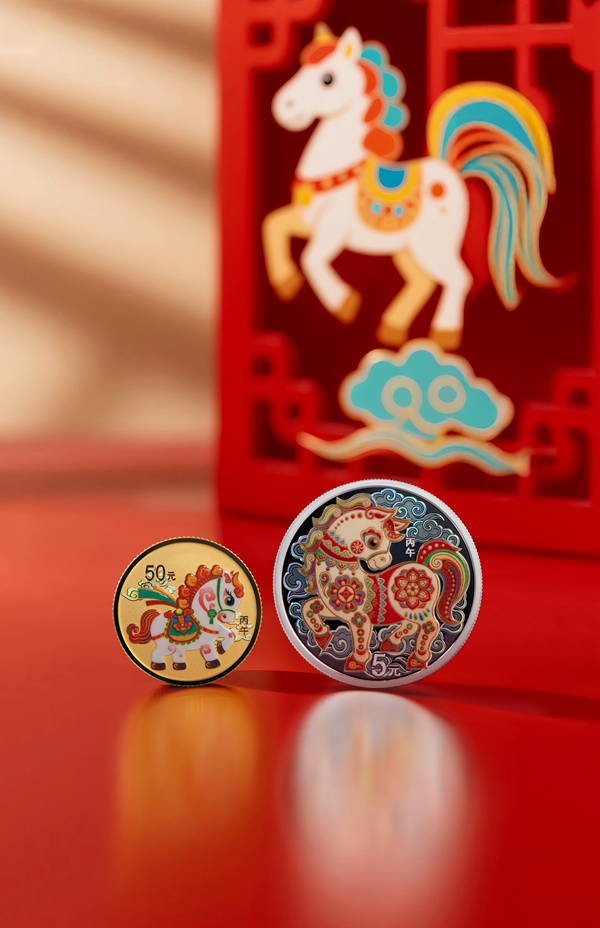 两枚纪念币背面图案均以小马驹为原型,加入多种喜庆吉祥元素,形成了别具匠心的“装饰马”形象,那漂亮可爱的样子让人忍不住想第一时间拿在手里,细细赏玩。图案背景衬以缭绕的祥云,营造了如梦似幻的仙境氛围,将普通的小马驹升华为象征福运的灵兽,恍如上界的神驹临凡,降下祥瑞,让2026农历马年充满欢声笑语。