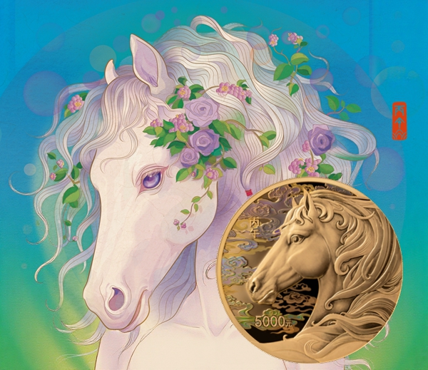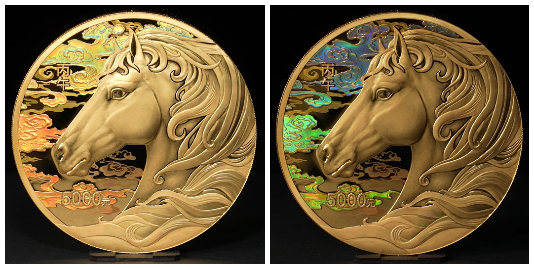 币面采用半清边的形式,使“主角”更加突出,彰显马的无拘无束。背景云纹在浮雕与激光基础上,采用传统绘画“渲染技法”,融合绿、红、褐等色彩,通过彩喷、光变鳞彩工艺形成层次丰富的变化,既模拟出了云气“缥缈变换”的质感,又以色彩丰富性与主体马匹的“素净金调(繁简对比,彩素呼应)”形成相互映照的视觉关系。这种大胆活泼的用色和工艺处理,充分调动起观赏者的视觉动感,其既以丰富的色彩层次和细腻的光影变化传递出生肖马文化中自由奔放的审美意蕴,亦使生肖马这一形象深植民族化的文化内涵和美学法则,不仅提升了这枚大规格金币的文化价值,更使生肖马形象从自然界的动物升华为富有内涵的文化图腾。这个马踏祥云的形象圣洁高远,洋溢着自然生命的活力和艺术清新的美感。