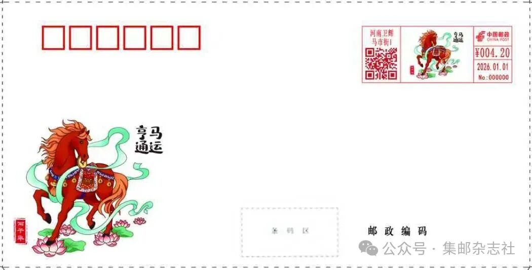 ![]() ![]() 经中国邮政集团有限公司批准,河南省新乡市卫辉市马市街邮政支局将于2026年1月1日启用“马运亨通”彩色数字打印型邮资机戳各一枚。 为方便大家收藏,《集邮》杂志微店上架了相关的实寄产品。 ![]() ![]() ![]() ![]() 挂号实寄封片套装 一组2枚,包含一封一片,使用美术封、美术明信片为载体,启用首日分别加盖邮资机戳,挂号实寄给预订者。识别上方二维码即可预订。 ![]() ![]() ![]() 挂号实寄邮资明信片 使用任意一枚普通型2026贺年有奖明信片为载体,启用首日加盖邮资机戳,另盖河南卫辉马市街邮政支局日戳,挂号实寄给预订者。识别上方二维码即可预订。