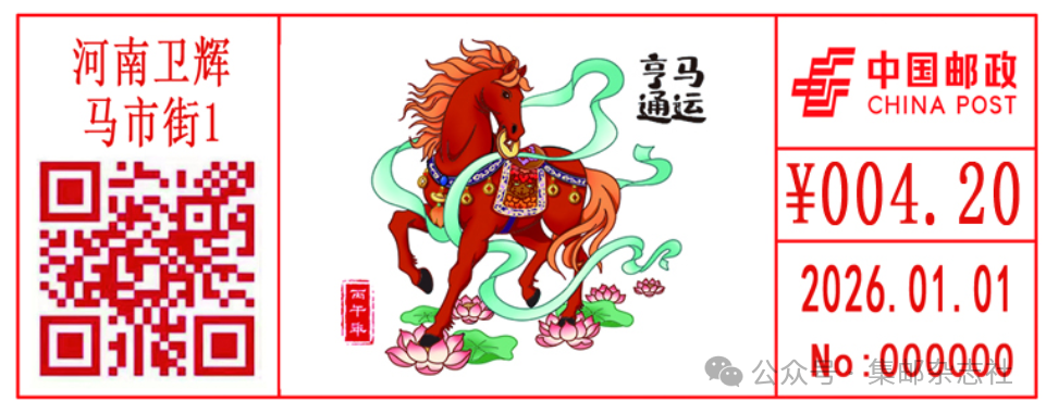 经中国邮政集团有限公司批准,河南省新乡市卫辉市马市街邮政支局将于2026年1月1日启用“马运亨通”彩色数字打印型邮资机戳各一枚。