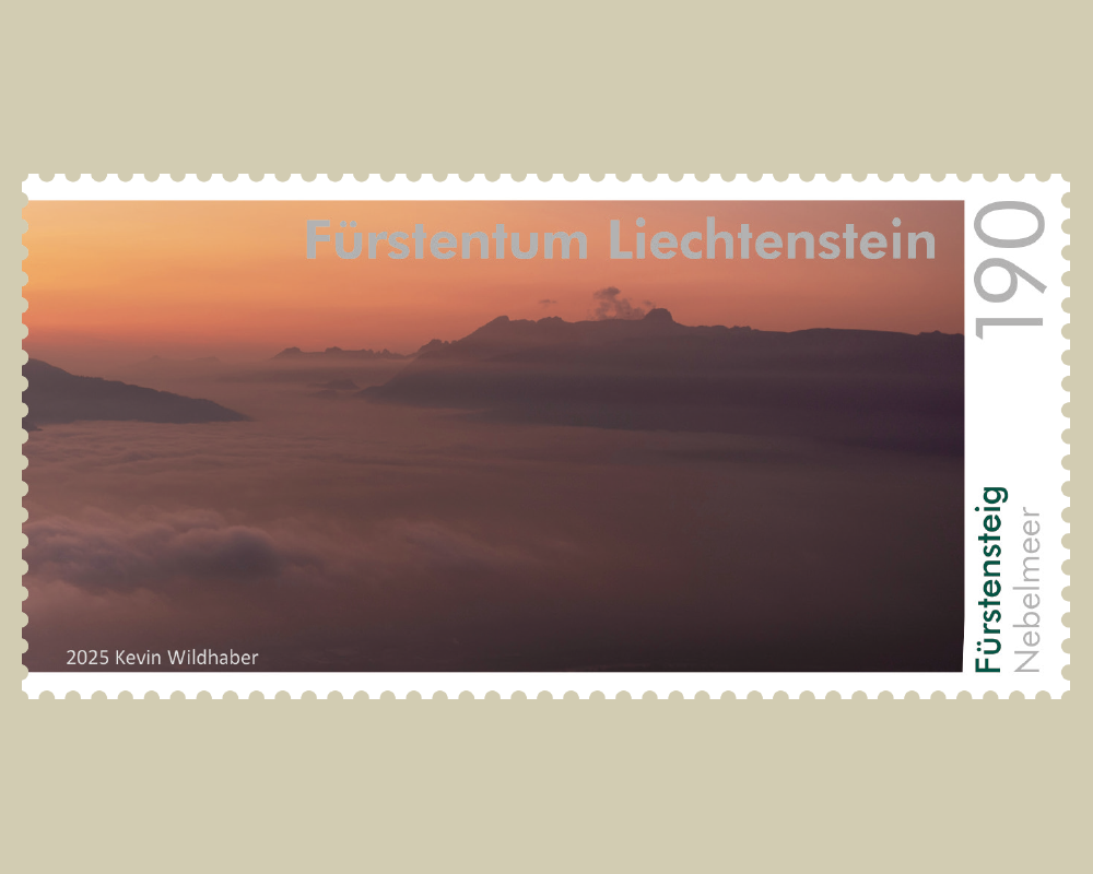 “库赫格拉特”(Kuhgrat)是这段多变登山路线的最高点,站在顶峰可以尽览“雷蒂孔山脉”(Rätikon)以及瑞士和奥地利福拉尔贝格(Vorarlberg)的壮丽群山。俯瞰下方,风景如画的莱茵河畔村庄以及远处的博登湖尽收眼底,让人难以忘怀;沿途丰富多彩的碎石坡植物群也别具吸引力。此枚邮票展示了王子之路的“雾海”景致。