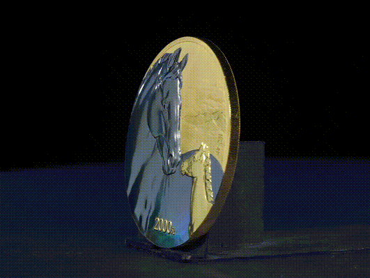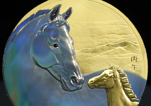色泽多元,呈现令人炫目的动态美感。尤其是母马,在光变鳞彩工艺基础上叠加了镀黑工艺。光变鳞彩工艺独特之处在于,从不同视角、不同光线下观赏币面,会呈现出层次丰富、色彩斑斓的视觉效果;镀黑工艺让黄金呈现黑色或深色色调,既有复古气息,又有神秘、潮酷个性。当光线从不同角度照射时,母马身上产生不同的光影变化;当光线流转时,乌黑中又透出彩虹般光泽,和金属本身的色泽融为一体,既庄重又有时尚感。这些创新工艺的运用,增添了“灵魂色彩”,提升了纪念币表现力。