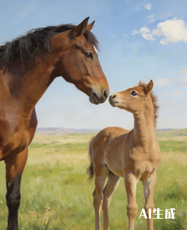 对比鲜明,栩栩如生。母马和子马,一高一低,一黑一黄,占据空间一大一小,和谐统一。母马眼神慈爱柔和,眼敛微微下垂,既充满关怀和爱意,也饱含历尽沧桑的宁静;子马眼神纯真好奇,清澈明亮,头部微微上扬,既有对母亲的依赖,又充满对未知世界的向往。母马肌肉线条有力而流畅,子马体态轻盈而灵动,鬃毛丝丝分明而有质感,超高浮雕工艺让这些细节纤毫毕现。此时无声胜有声,展现了蓬勃的生命力和多层次的情绪状态。