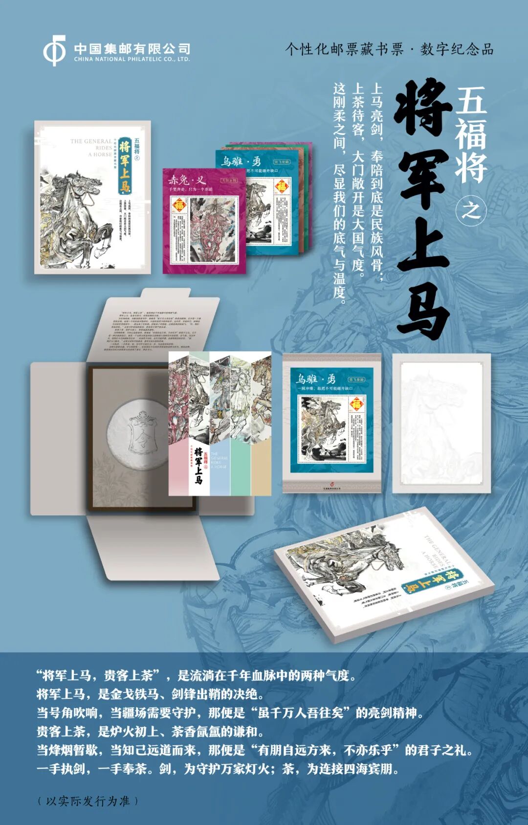 邮票珍藏:五版个性化邮票,以关羽、张飞、赵云、马超、黄忠五位虎将与战马(赤兔、乌骓、照夜玉狮子、里飞沙、燎原火)为灵感,融合传统三国文化与现代伙伴精神。每一张个票,都是对“英雄”的赞美;每一匹战马,都是对“忠勇”的象征。