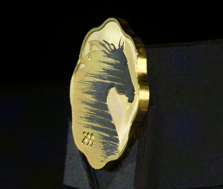 3克金币由于直径仅18毫米,为了更好展现马身上繁复的细节花纹,运用了微缩工艺,画面纤毫毕现,背景则采用浅浮雕和光变鳞彩工艺,流光溢彩。