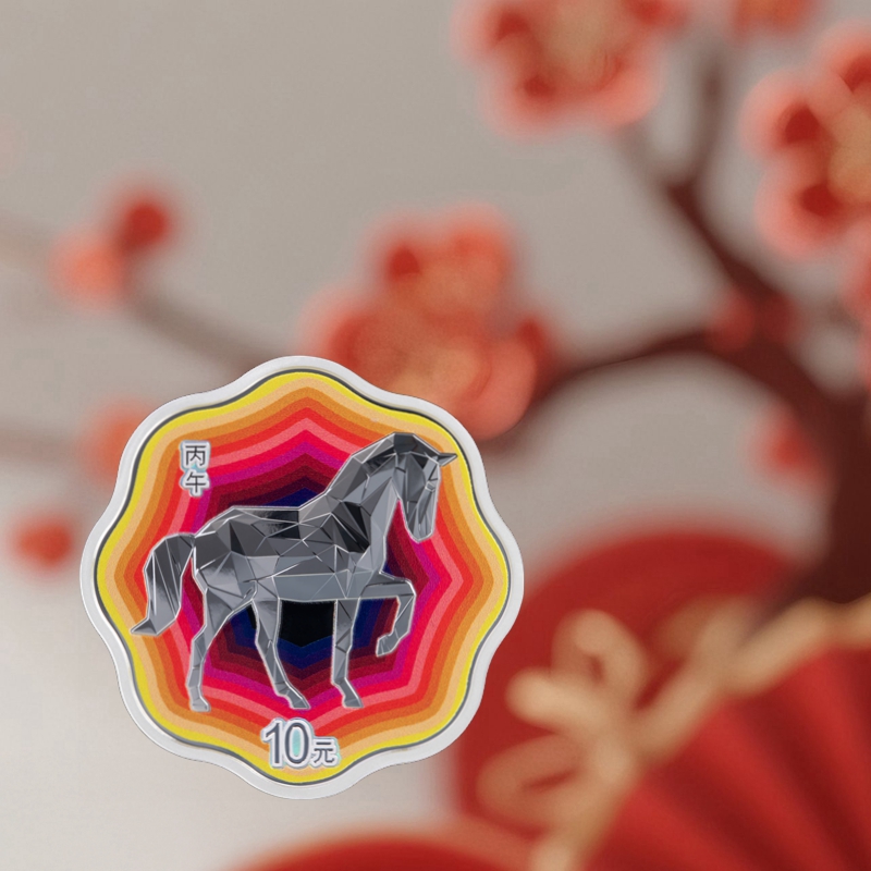 小规格币种中的30克梅花形银币,主体图案以钻石切割形式塑造马的造型。马身轮廓清晰,各部位由棱角分明的立体几何切面拼接而成,散发着如钻石般的光彩,背景为从中心向外辐射的渐变彩色,图案极具时尚感和科技感。