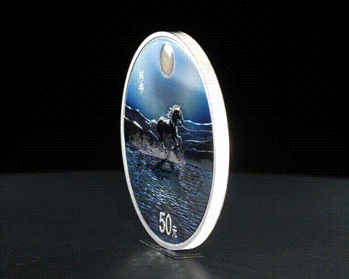 150克银币的图案则有着强烈的水墨画韵味,一匹骏马飞驰于湖面,四蹄溅起的水花向周围蔓延,极富动感与张力;远处的群山显得格外的静谧,进一步突显了奔马的灵动与矫健,透着一股舍我其谁的自信。画面意境深远,富有浪漫主义的情感,同时还暗含着“乾坤未定,你我皆是黑马”的深意。