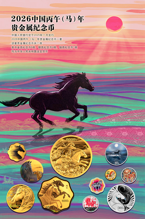 2026年恰逢中国传统丙午马年,为传承悠久的生肖文化,迎接农历新年的到来,中国人民银行于2025年11月26日发行了2026中国丙午(马)年贵金属纪念币一套。该套贵金属纪念币共11枚,包括金币6枚,银币4枚,铂币1枚,均为中华人民共和国法定货币。作为年度重头戏,该套马年生肖贵金属纪念币备受广大藏友关注,11枚币一币一图,设计、工艺、寓意等均颇具匠心巧思,可圈可点。