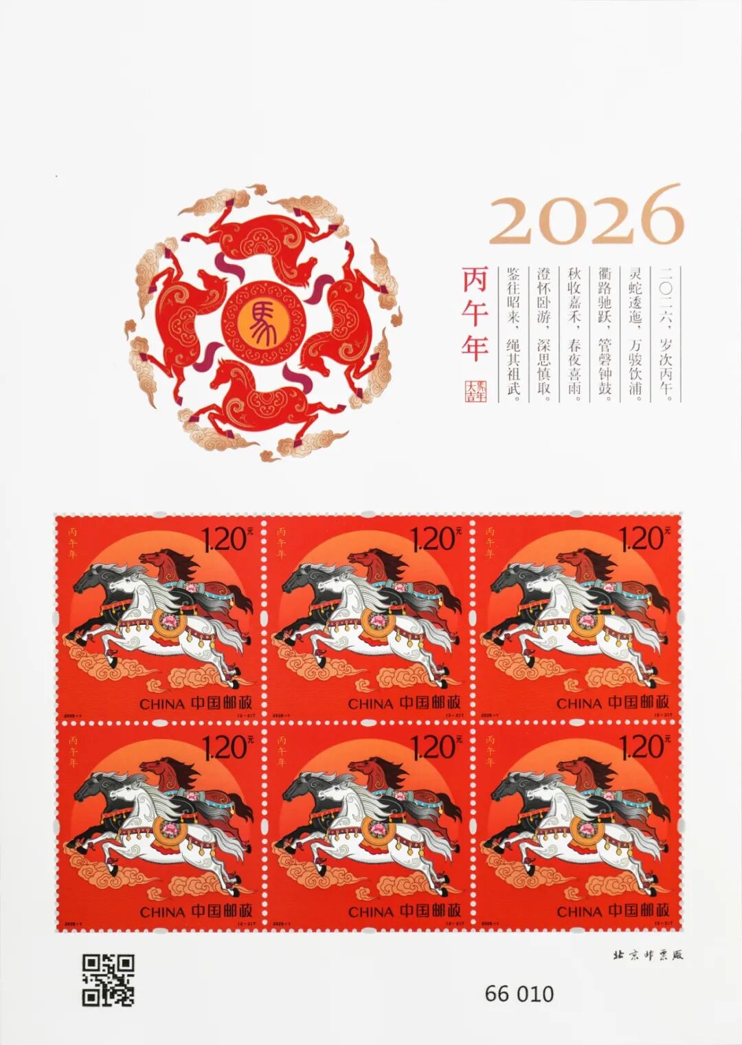 注:同时发行《丙午年》邮票版式三(整张枚数:2套4枚;整张规格:120×160毫米;边饰设计者:刘喜飞;对联作者:常江)。计划发行数量:288万版。用于赠送给预订2026年全年纪特邮票的预订户。