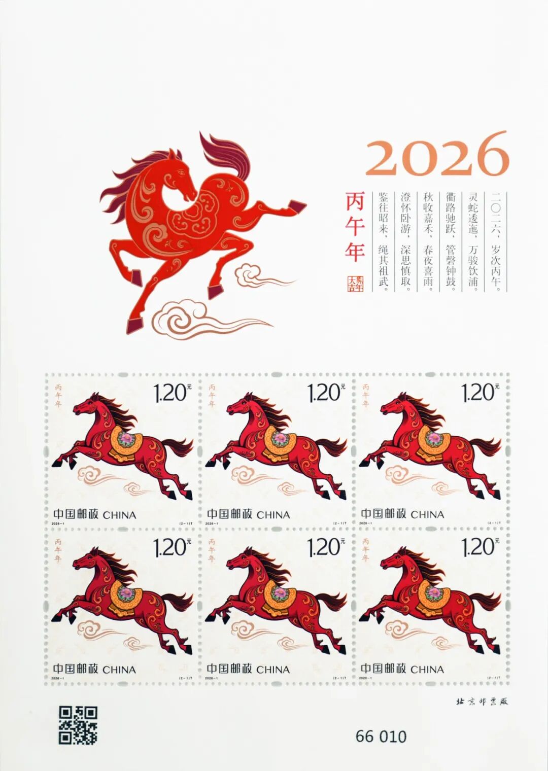 第一枚邮票图中红马踏云、鬃毛如焰,表达了在新的一年里,对党全面领导下国家经济社会发展继续行稳致远,向着“十五五”时期主要目标接续奋进的美好期许。