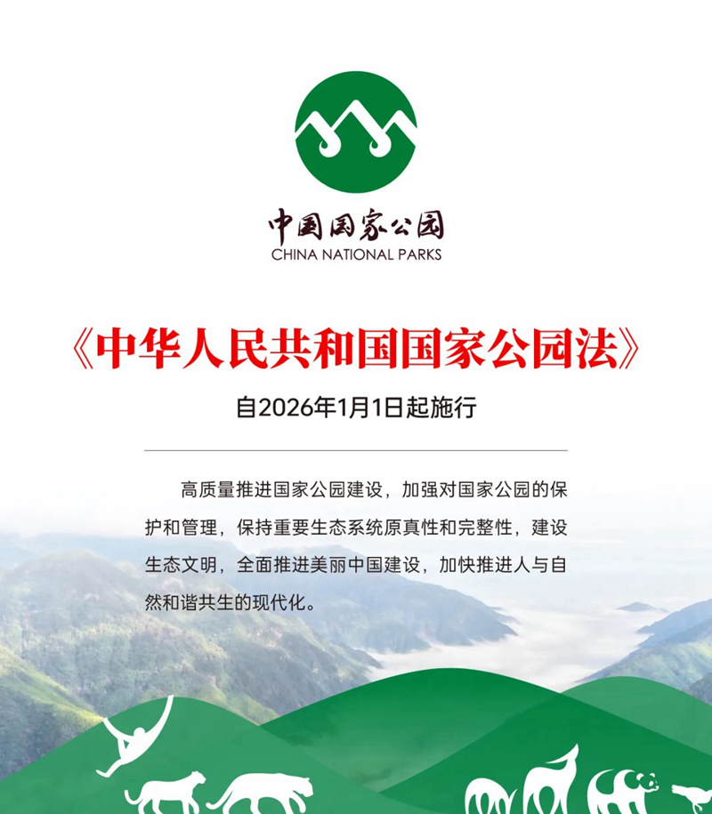 《中华人民共和国国家公园法》于2025年9月12日经第十四届全国人民代表大会常务委员会第十七次会议通过,由国家主席习近平签署第五十三号主席令公布,自2026年1月1日起正式施行。