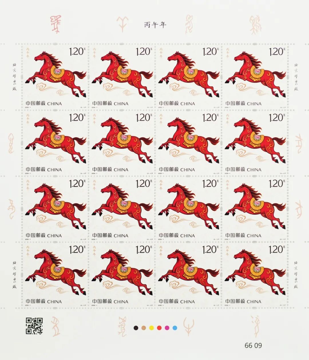 1月5日发行的《丙午年》特种邮票是中国邮政发行的第四轮生肖马邮票,由清华大学美术学院王红卫教授和设计师赵恩重联袂设计。邮票以写实、装饰相结合的手法,描绘了充满活力的生肖马形象,象征着勇往直前的奋进精神和对马年的美好期盼。