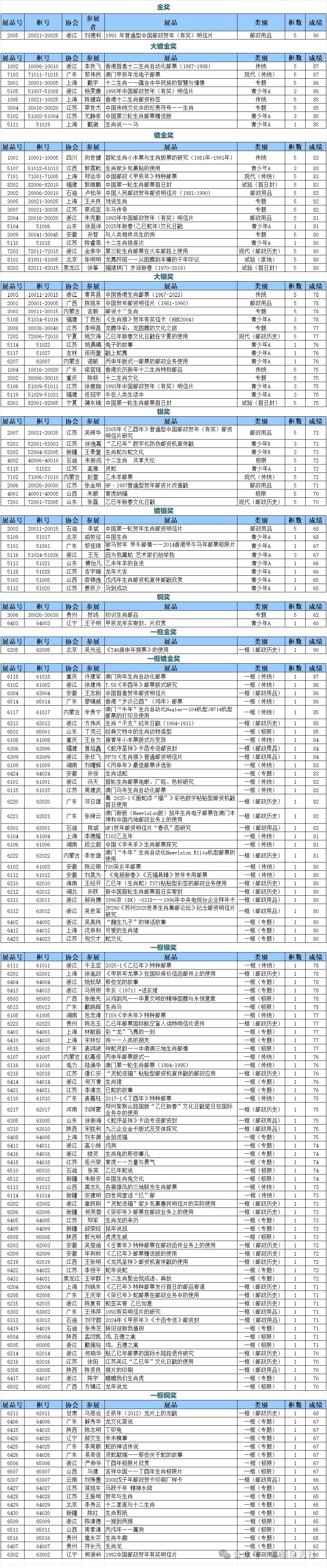 ![]() ![]() ![]() 第三届生肖集邮展览于昨日落下帷幕。本次邮展共展出来自全国29个省级集邮协会的竞赛性展品155部302框。本届邮展评审委员会依据《中华全国集邮联合会集邮展览规则》,参照国际集邮联合会(FIP)集邮展览评审总规则及各类别评审专用规则和指导要点的评分标准,根据本次邮展的特别规则,共评出金奖1部、大镀金奖8部、镀金奖14部、大银奖14部、银奖9部、镀银奖8部、铜奖2部;评出一框金奖1部、一框镀金奖29部、一框银奖51部、一框铜奖18部,本届邮展展品获奖详情如下。 ![]()