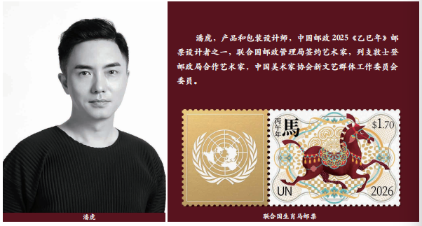 这套联合国邮政管理局(UNPA)定于2026年伊始正式发售的马年生肖邮票由中国设计师潘虎先生设计。这也是继狗年(2018)、虎年(2022)、兔年 (2023)、龙年(2024)和蛇年(2025)之后,他的第6件联合国生肖邮票作品。