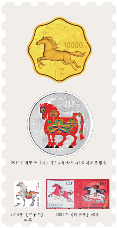 马在十二生肖中排行第七位,因在十二地支中与“午”相配,所以人们常称其为“午马”。马被视为力量与速度、忠诚与勇敢、自由与奔放的象征,拥有勇往直前、生生不息的吉祥寓意,深受民众的喜爱。2026年为农历丙午(马)年,中国邮政与中国人民银行陆续发行了2026年《丙午年》特种邮票及2026中国丙午(马)年贵金属纪念币。品鉴这些最新发行的马年藏品,让人心旷神怡之余,略感意犹未尽。实际上,以生肖马为主题的邮币还有不少,不妨让我们选取其中颇具代表性和特色的品种,一同来回顾和品鉴其别具一格的风采。
