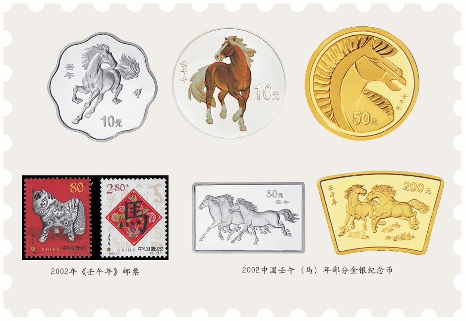 第二轮生肖贵金属纪念币中,后几个生肖图案的设计不再以借鉴名家名作为主,而是探索出了一条多样化的设计之路,在纪念币的形制上也逐渐引入了梅花形、扇形、长方形等异形形制。这个特点自然也体现在了2002中国壬午(马)年金银纪念币上,该套生肖币的背面图案中既有名画,又有设计者原创的奔马图,还有马头的装饰造型图,以及彩色的骏马图。