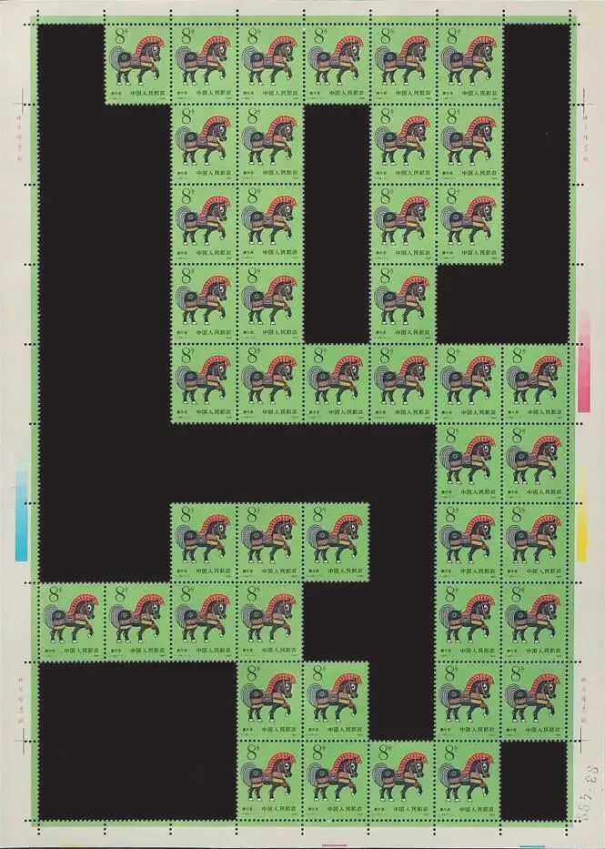 整版邮票上,翠绿底色如茵茵芳草般鲜活,神驹红鬃飞扬、黑身矫健,每一枚邮票都涌动着蓬勃的生命力。这位邮友小心翼翼地沿齿孔撕开,用邮票拼出“马”字轮廓:先以上排6枚邮票和右侧5枚邮票拼出“马”字的横折笔画,右侧的5枚邮票犹如飘逸的马鬃;再用中间的26枚邮票拼出“马”字的竖折钩笔画,流畅的线条仿佛勾勒出马颈、马脊的轮廓,其中最下排的4枚邮票既稳稳托住整幅字面,又似马蹄轻踏大地;最有趣的当属左下方错落有致的7枚邮票,既可作为“马”字最后的一笔横画,又如潇洒飞扬的马尾,给这个用版票撕出的“马”字增添了抑扬顿挫的书法意蕴和俏皮感。