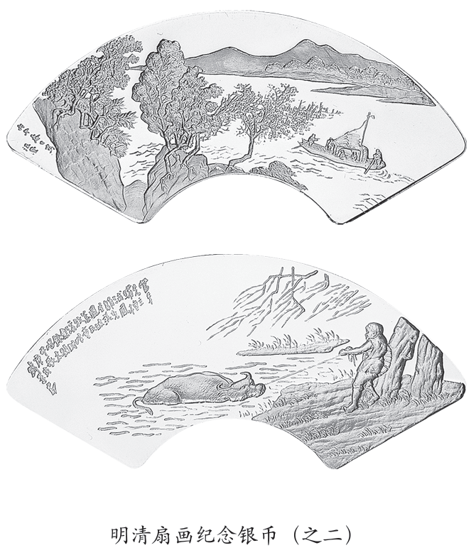 2023年发行的中国古代名画系列(千里江山图)金银币,将鲜亮的青绿山水、承平的笔意墨韵、对锦绣山河的膜拜敬仰之情,全部凝聚在币面之上;1999年发行的明清扇画纪念银币表现了“明清扇面画”中的经典作品,汲取了谦冲而温厚、含蓄而神秘的美学特点。它们来自自然,与大自然共振,一如神奇幽远的东方文化,静观内省的中国人最能够从精神内涵上欣赏这套异形银币。