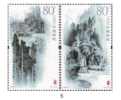 姜伟杰对郝欧雕刻全程加以指导,并不时到放大镜前看一看雕刻的效果。在老师的悉心指导下,郝欧花了半个多月的时间,完成了《壬午年》第2枚邮票的雕刻。姜伟杰对郝欧的认真、严谨与扎实,特别是悟性和灵气,看在眼里、记在心里。不久,破例地收郝欧为徒,这也是他从事雕刻艺术几十年里收的唯一弟子。2006年,师徒俩还一块合作了《青城山》邮票(图5为其中两枚)的雕刻。