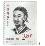 邮票雕刻是慢工细活,技艺与功力也是“十年磨 一剑”(图2,郝欧在手工雕刻作业中)。郝欧雕刻的第1枚邮票是2000年与姜伟杰、李庆发、阎炳武、呼振源等几位老师一道完成的《古代思想家》邮票,她承担了其中“荀子”一枚(图3)的雕刻。